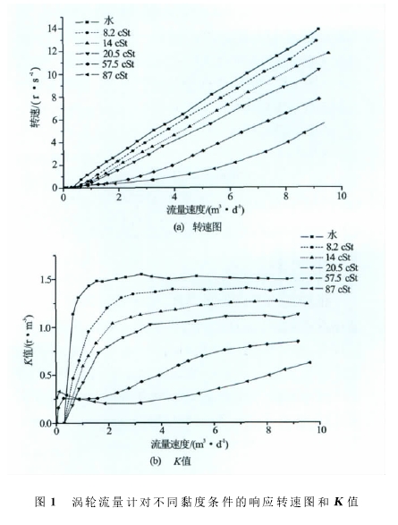 圖1渦輪流量計對不同黏度條件的響應轉速圖和K值