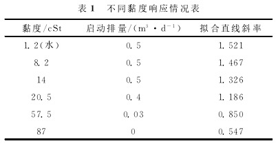 采用水和PAM溶液,在上述實驗平台上對渦輪流量計在0~10m³/d的範圍內的響應情況進行觀察。通過調整配比,得到了純水、8.2、14、20.5、57.5cst和87cst等6種不同表觀黏度的流體並觀察了直徑19mm的渦輪流量計對其響應的情況。圖1反映了渦輪流量計在低流量條件下對不同黏度的流體的響應情況。從圖1可見,隨著黏度的增加,渦輪流 量計的K值下降,且線性度也變差。對圖1中各黏度條件下的響應結果進行線性擬合,並結合實驗中測量到的啟動排量進行比較得到表1所示數據.。