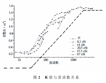 圖2表明,在雷諾數低於2000(即層流)的條件下,渦輪流量計的K值受雷諾數影響顯著。從圖2中可以看出,K值與雷諾數之間有相關性,隨著雷諾數的增加呈現3個階段:當雷諾數*低(小於20)時,渦輪流量計近似保持一個固定的K值;隨著雷諾數的增加(雷諾數在20~1000),渦輪流量計的K值與雷諾數近似呈指數關係;當雷諾數較高時(大於1000),渦輪流量計進入線性響應,K值穩定不變。同Funress的結果相比,在K值與雷諾數的指數關係段,本文實驗結果與指數關係(圖2中粗實線)有一定的偏差。本文實驗采用的聚合物溶液不同於Funress實驗采用的油,聚合物溶液是非牛頓流體,在不同剪切率條件下,其表觀黏度不同。隨著剪切率(在本文實驗中流速是剪切率的主要影響因素)的上升,其表觀黏性係數會下降。對比圖2曲線,以聚合物黏度為8.2cst的響應曲線為例,曲線的起始段低於指數關係,是由於流速較慢剪切率較低,其表觀黏度較大,實際雷諾數應該稍低,圖2中曲線應向左稍稍平移;流速較高的響應點K值高於指數關係直線則是由於剪切率較高時,表觀黏度減小,實際雷諾數更大,需將響應點向右平移。因而實際的雷諾數與K值的關係,需結合聚合物溶液的表觀黏度變化情況進行修正。