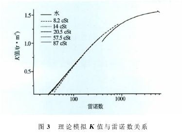采用Thompson等提出的理論模型,入口速度設置為層流,對實驗中的工況進行模擬。將求解後得到的K值與雷諾數的關係繪製在圖3中。比較圖2與圖3可看出,理論模擬與實驗結果在前文所述的K值指數增長階段與穩定階段基本相符,*低雷諾數條件下穩定的小K值難以通過傳統的理論方法進行模擬。理論方法可以作為低流量條件下渦輪流量計在黏度不超過50cst的黏性流體中響應情況的快速計算分析手段。通過理論和實驗表明,在渦輪流量計進入線性段K值穩定之前,渦輪K值與雷諾數呈指數關係。不過需要指出的