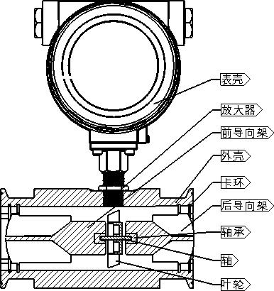 圖所示為渦輪流量傳感器結構簡圖,由圖可見,當被測流體流過傳感器時,在流體作用下,葉輪受力旋轉,其轉速與管道平均流速成正比,葉輪的轉動周期地改變磁電轉換器的磁阻值。檢測線圈中的磁通隨之發生周期性變化,產生周期性的感應電勢,即電脈衝信號,經放大器放大後,送至顯示儀表顯示。