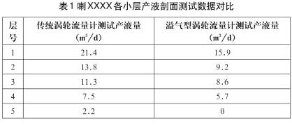 圖1、圖2為該井全井流量測試曲線,從圖1可以看出使用傳統渦流量計測試時該井流量曲線受到井內原油脫氣影響產生了較大跳動,對流量測試產生了較大的幹擾,測試結果為56.2m 3 /d。而采用溢氣型智能渦輪流量計測試後,測試曲線較為平穩、衝次明顯(圖2),渦輪沒有受到原油脫氣影響,說明溢氣型短節排氣效果良好,全井流量測試結果僅為39.4m 3 /d。為了進一步對比,地質部門對該井進行了罐車量油,量油結果為產液39.1 m 3 /d。由此可見,溢氣型智能渦輪流量計流量測試結果明顯優於傳統的智能渦輪流量計測試結果,那麽其測試的各小層產液數據也就更加準確,因此測試脫氣嚴重的抽油機井產液剖麵時應該盡可能采用溢氣型智能渦輪流量計。表1為喇XXXX井各小層流量測試結果,可以看出使用傳統智能渦輪流量計測試的各小層流量均高於溢氣型智能渦輪流量計測試結果。測試層5時傳統智能渦輪流量計測試結果為2.2 m 3 /d,而實際上渦輪轉動是氣體衝擊導致的,采用溢氣型智能渦輪流量計後發現該層產液量低於啟動排量無法測試。