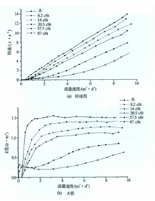 圖1一體化智能渦輪流量計對不同茹度條件的響應轉速圖和K值