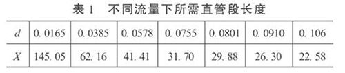 3.直管段長度和軟化水計量表精度的初步預測在工程設計中,根據流體性質、流量和雷諾數確定α和d值。這樣,按照式(5)就可以依不同的流量計精度要求,對直管段長度進行初步預測,或確定直管段長度後,對流量計的精度做初步預測。當δ= 0.2%時,不同流量下所需直管段長度見表1。