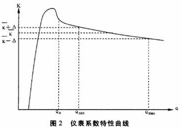 圖2顯示測量出電脈衝信號頻率F用平均儀表係數`K計算得到的Q值,在Qmin~Qmax範圍內的*大相對誤差為: