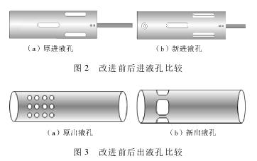 防砂卡防爆渦輪流量計結構如圖1所示,主要由防爆渦輪流量計、篩狀出液孔、防爆渦輪流量計安裝短接、解卡管、解卡管開槽、中心管、長條孔(銷釘運動槽7)、薄壁筒、進液孔、解卡管固定銷釘、含水傳感器安裝筒組成。采用等效麵法,將進液孔一分為二,改為寬2mm的矩形進液孔,解決從進液孔進入的長垢片或大垢片造成的砂卡,如圖2所示。將原先3個方型的出液孔改為直徑4mm的陣列狀的篩孔,解決儀器在下井過程中從出液孔進入儀器的長垢片、大垢片造成的砂卡,如圖3所示。