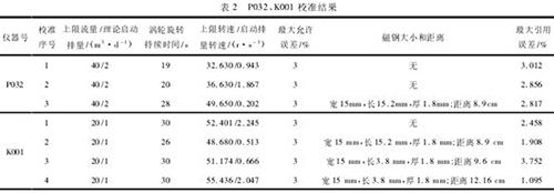 由表2可知,解卡裝置末端粘貼寬15mm、長15.2mm、厚1.8mm的弧形磁鋼,安裝距離防爆渦輪流量計磁鋼8.9cm時,P032*3次渦輪葉片轉動持續時間28s,40m3/d平均轉速49.650r/s;同樣的磁鋼大小和安裝距離,K001*2次調試渦輪,葉輪轉動持續時間26s,*大引用誤差1.908%合格,啟動排量1m3/d時,平均轉速0.513r/s,不合格。K001*3次,解卡裝置末端粘貼寬15mm、長3.8mm、厚1.8mm的弧形磁鋼,安裝距離防爆渦輪流量計磁鋼9.6cm,渦輪沒有調試持續時間30s,但校準結果*大引用誤差3.752%不合格,啟動排量1m3/d沒有啟動,平均轉速0.666r/s不合格。K001*4次,重新調試渦輪,持續時間30s,同時將寬15mm、長3.8mm、厚1.8mm的弧形磁鋼,距離防爆渦輪流量計磁鋼的距離調整為12.16cm,*大引用誤差1.095%,啟動排量1m3/d啟動,平均轉速2.587。故*終確定弧形磁鋼寬15mm、長3.8mm、厚1.8mm,距離防爆渦輪流量計磁鋼的距離為12.16cm。此時在流量計啟動排量時,渦輪葉片轉動。