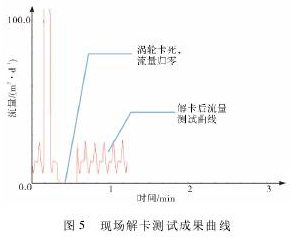 防砂卡防爆渦輪流量計在五大隊成功解卡370井次,現場解卡測試曲線見圖5。剛測試時,渦輪葉片轉動正常,大約在20s左右,由於流體帶進的雜質導致流量曲線歸零。通過儀器二芯供電收傘,大約15s後再開傘,一芯流量供電測試,渦輪葉片通過瞬間開收傘,擴大了葉輪與渦輪殼體之間的空間,雜質通過渦輪葉片旋轉正常。從曲線可以看出,在解卡前和解卡後,渦輪旋轉--致,都為15m3/d左右,而且解卡前後衝次一致,防爆渦輪流量計解卡裝置有效解決了因油井出砂、垢片、間隙小造成的砂卡,砂卡率由原先的70%降低到30%,實現了產液剖麵流量準確測試。