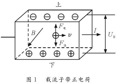 情形1:單種載流子。如圖1所示,若載流子帶正電荷,則載流子在洛倫茲力作用下會向下偏轉,導體下表麵積累正電荷。同時,上表麵失去正電荷而帶上負電,從而使下表麵電勢高於上表麵。