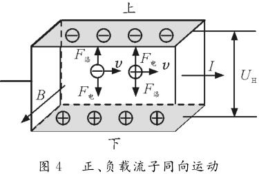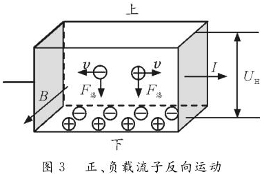 情形2:正、負載流子反向運動。如圖3所示,長方體玻璃水槽中盛有NaCl的水溶液,水槽左、右側壁內側各裝一導體片,在溶液中通入水平向右的電流,勻強磁場B垂直紙麵向外。NaCl溶液中既有正離子,又有負離子,根據左手定則可判斷正離子受到向下的洛倫茲力,故向下運動並堆積。同理,負離子也受到指向下的洛倫茲力,也向下運動並堆積。由於正負離子均向下側麵堆積,故上下兩側麵的電勢均為零,但下側麵處離子濃度大於上側麵離子濃度。