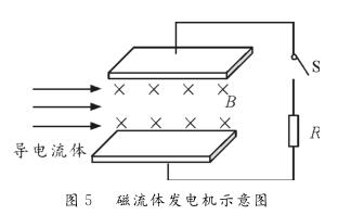 【例1】圖5為磁流體發電機示意圖。設兩金屬板間的距離為d,兩*板間勻強磁場的磁感應強度為B。等離子體垂直進入磁場的速度為v,單個離子所帶的電荷量為q。離子通道(即兩*板內所圍成的空間)的等效電阻為r,負載電阻為R。則下列判斷正確的是( )