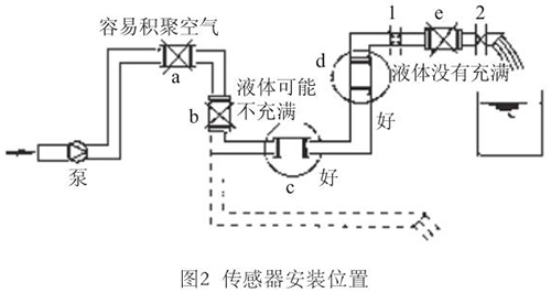 液體流動方向必須與傳感器殼體上箭頭方向一致。對於能正反向測量的冷凍水回91看片视频免费,若方向不一致雖仍可測量,但設定的顯示流動正反方向不符,必須改正之。若拆傳感器工作量大,也可改變傳感器上箭頭方向和重新設定顯示儀表符號。管道未充滿液體主要是管網工程設計或傳感器安裝位置不妥,使傳感器測量管內不能充滿液體。應采取措施,避免安裝如圖2所示a,e位置和以虛線管排放時b位置,改裝到c,d位置。