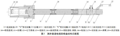 注入剖麵測試中,溢流量對測量結果影響至關重要。如圖 1 所示,測井普通防噴盒采用 3 級密封: * 1 級密封為阻流管( 6) ,測 20 井次左右阻流管內徑變大,溢流量增加; * 2 級為橡膠盤根和鋼墊( 15) ; * 3 級為橡膠盤根( 10) ,調整壓帽( 11) 鬆緊程度,橡膠盤根抱緊電纜; * 2 級和* 3 級密封更換一次橡膠盤根測試 3 ~ 5 井次溢流量增加。普通防噴盒無法實現溢流量,沒有捕捉器、防噴器和放噴組裝件。普通電纜防噴裝置工作壓力20 MPa,耐壓 40 MPa。