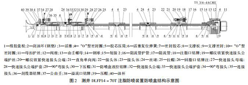 如圖 2 所示,DLFP14 - 70T 注脂防噴盒有 1 個注脂口、1 個回脂口、1 個防噴盒液控口、1 個刮纜器液控口及1 個溢流口,主體內裝有 6 根阻流管。DLFP14 - 70T 注脂防噴盒采用 4 級密封: * 1 級密封采用注脂密封,撬裝注脂泵從注脂口注入高壓高粘度密封脂於 6 根阻流管與電纜間隙; * 2 級密封采用液壓密封,氣動液壓泵主加壓和手壓泵補加壓結合從防噴盒液控口注入液壓油,推動活塞擠壓膠芯壓筒; * 3 級密封采用液壓密封,手壓泵加壓從刮纜器液控口注入液壓油,推動活塞擠壓膠芯壓筒實現密封和刮油作用; * 4 級密封油杯、橡膠盤根和刮油環( 鋼 墊) 。DLFP14 - 70T 注脂防噴裝置配有液控上、下捕捉器、液控雙閘板防噴器和放噴組件,根據實際可以調整溢流量,實現零溢流密閉測井施工。 DLFP14 - 70T 注脂防噴裝置工作壓力 70 MPa,耐壓105 MPa。