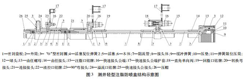 綜上所述,結合普通防噴裝置和 DLFP14 - 70T 注脂防噴裝置的結構特點,研究設計輕型注脂防噴裝置。如圖 3 所示,輕型注脂防噴盒有 1 個注脂口、1個回脂口、1 個防噴盒液控口、及 1 個溢流口,主體內裝有 2 根阻流管,但阻流管沒有護管。輕型注脂防噴盒采用 3 級密封: * 1 級密封采用注脂密封,注脂泵從注脂口注入高壓高粘度密封脂於 2 根阻流管與電纜間隙; * 2級密封采用液壓密封,手壓泵補加壓結合從防噴盒液控口注入液壓油,推動活塞擠壓膠芯壓筒; * 3 級密封采用壓帽、橡膠盤根和鋼墊。輕型注脂防噴裝置。與 DLFP14 - 70T 注脂防噴裝置比較: 沒有液控上、下捕捉器和液控防噴器; 液壓密封采用手壓泵; 注脂泵采用小型氣動液壓泵; 防噴盒沒有刮纜器密封和刮油部分; 阻流管壁厚加厚,沒有護管。輕型注脂防噴裝置工作壓力 21 MPa,耐壓 42 MPa。