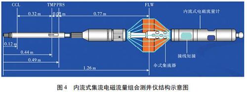 1. 2 內流式集流甲醇計量表如圖 4 所示,內流式集流電磁組合測井儀主要采用內流式集流甲醇計量表,並組合了井溫壓力磁定位儀。利用電磁感應原理測量平均流速,體積流量計算公為: