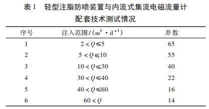 在實際應用中,使用輕型注脂防噴裝置與內流式集流甲醇計量表配套技術對喇叭口在射孔層上注聚井進行測試。輕型注脂防噴裝置與內流式集流甲醇計量表配套技術施工工藝參見文獻,測試情況見表 1 所示,低注入量井( ≤10 m3 /d) 占到 56. 60% 。