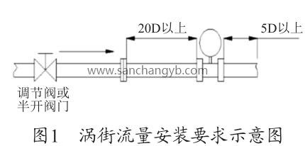 根據圖1渦街流量安裝要求示意圖及廠家的設備說明書要求,流量計上遊的直管段長度至少為20D≈1 600mm,下遊的直管段至少在5D≈400mm,D=80mm 為管道直徑。圖2為現場安裝圖,流量計上遊僅為600mm <1 600mm,此流量計安裝位置有誤,對測量值有一定的影響,造成測量偏差,需調整流量計的安裝位置。