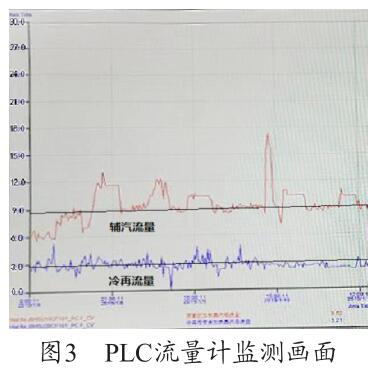 通過圖3 PLC 流量計監測畫麵可以看出,PLC 上輔汽測量用的氣體渦輪流量表的量程設置為30t/h,現場設備量程實際為6t/h,兩者嚴重不符,因此測量值4t/h 為錯誤值(單台機組運行),需要對程序進行修改。