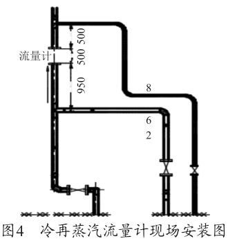 根據圖1渦街流量安裝要求示意圖及廠家的設備說明書要求,流量計上遊的直管段長度至少為20D≈1 300mm,下遊的直管段至少在5D≈325mm,D=65mm 為管道直徑。圖4為冷再蒸汽流量計現場安裝圖,流量計上遊僅為950mm<1600mm,此流量計安裝位置有誤,對測量值有一定的影響,造成測量偏差,需調整流量計的安裝位置。