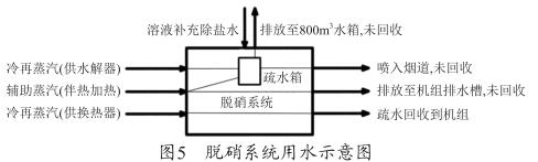 從圖5可以看出,脫硝係統所使用的冷再蒸汽和輔助蒸汽換熱後全部冷凝為疏水,供水解器的蒸汽和部分伴熱加熱的蒸汽回收至脫硝係統的疏水箱,部分伴熱蒸汽疏水直接排放至機組排水槽,未進行回收。疏水箱的水一部分被脫硝係統利用,另一部分排放至機組800m 3 水箱,未進行回收。下麵結合耗水量對蒸汽耗量進行判斷 :
