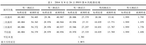 表1為2014年8月24日P033*6次校準結果。本次校準平均K值1.301r/(m3?s),大於1.0r/(m3?s),同時*大引用誤差為1.08%,小於*大允許誤差3%,啟動排量2m2/d時的平均轉速1.850r/s,因此P033校準合格。同樣,P032、K001、K018先後校準合格。因此,在啟動排量、*大允許誤差合格的前提下,K值大於等於1,K值可以評價解卡管、進液孔、出液孔造成的局部阻力損失。