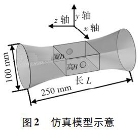使用 Pro /E 軟件建立三維幾何模型,導入 COMSOL 軟件進行有限元求解。仿真模型如圖 2 所示,電*連線為x 軸,連線中點為坐標原點,流體運動方向為 z 軸,傳感器管道口徑為 DN100,總長250 mm。異徑管部分初始結構尺寸 L = 80 mm,D = 80 mm,H = 40 mm,圓形電*半徑為17 mm,伸出絕緣襯裏的*大距離為 1. 5 mm。