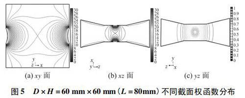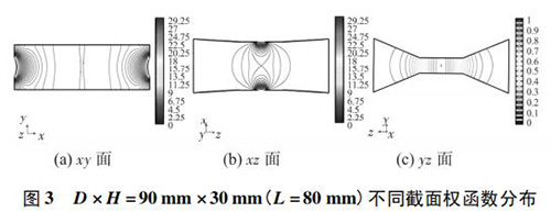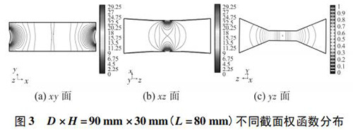 4) 圖 3( c) 、圖 4( c) 的 yz 麵權函數分布表明,D = 90 mm時的權函數等勢線間距略大於 D = 60 mm 時的權函數等勢線間距,權函數變化梯度較小,且中心區域的權函數等勢線逐漸變為直線,因此 D = 90 mm 的權函數分布更均勻一些,但是兩者區別很小,即寬度改變對 yz 麵權函數分布影響很小。圖 4( c) 、圖 5( c) 的 yz 麵權函數分布表明,H = 30 mm時的權函數等勢線間距較大,且中心區域的權函數等勢線逐漸變為直線,因此 H = 30 mm 的權函數分布更加均勻;