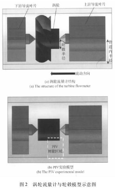 實驗在中國科大水平循環水實驗平台上進行,實驗采用20mm口徑的柴油計量表,量程範圍是1~80方/天,其中較好線性段範圍是5~50方/天,流量計渦輪為等重疊度渦輪(不同半徑位置葉柵重疊度相同),具體參數如表1所示,這種流量計在大慶油田的生產測井中廣泛應用,其結構如圖2(a)所示。來流經過一段導流葉片整流後進入渦輪的環空空間,驅動葉輪轉動,輸出響應信號。在柴油計量表的線性響應區間中,處於穩定轉動時渦輪葉片對流體的幹擾較少,相對來流攻角較小,對流體的軸向速度分布基本沒有影響,僅會稍稍增加其周向轉速。因而為了測量柴油計量表入口速度分布,特別製作了各參數與實際渦輪相同但並無葉片的透明外殼輪轂模型,如圖2(b)所示,通過PIV手段,對管道中軸麵上輪轂和管壁之間的區域的軸向速度分布進行剖麵測量。輪轂模型安裝在待測柴油計量表的上遊,相距超過2m以保證二者之間無相互幹擾。實驗流速範圍在5~25方/天,在管路下遊采用時間-質量法獲得真實流速,通過光學觀測獲得柴油計量表葉輪的真實轉動頻率,同時采用PIV技術測量輪轂模型中的速度分布。