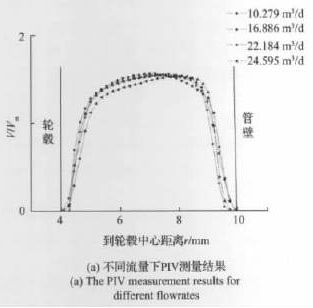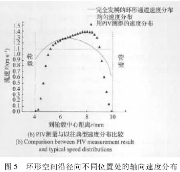 實驗中流量計的渦輪輪轂半徑為4mm,而管道內徑為10mm,因而速度分布都在這6mm的區間內。通過圖像處理可以獲得32個不同位置的速度,在此基礎上進行插值即可獲得整個環空流場的軸向速度分布。圖5(a)反映了實驗所測得的幾個不同工況點的軸向速度分布,從圖中可以看出,流速在中間位置較高,由於邊界層的影響,在靠近輪轂和管壁附近流速逐漸趨近於零。隨著流速的升高,整體速度分布向管壁方向偏移,速度*大值位置半徑增大,輪轂表麵邊界層厚度增加,管壁表麵邊界層厚度減少。與Xu采用LDA測量的結果相比,本文結果在半徑較大處速度較高,二者的不同結果也反映了不同設計的柴油計量表入口速度分布存在差異。相比LDA而言,PIV可以更加全麵地獲得輪轂與管壁之間的流速分布信息。
