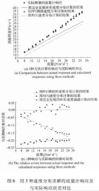 分別計算各個響應在不同流量點處與真實響應的相對誤差,結果如圖6(b)所示。從圖中可以明顯看出,用PIV獲得的速度分布計算的結果與實際響應的相對誤差*小,在3%以內;用均勻入口速度分布計算的結果誤差*大;用完全發展的環形通道速度分布當雷諾數超過2000時,由於計算模型假設由層流的速度分布直接轉變為湍流的速度分布模型,未能合理地反映實際流動中逐步轉變的過渡階段,導致理論結果與實際速度分布有較大差異,所以誤差較大。通過這些對比不難看出,獲得真實的速度分布能更為準確地計算柴油計量表的實際響應。麵對複雜的上遊來流條件,PIV結果更能反映柴油計量表內部流動的主要特征,這也從另一個側麵表明,對柴油計量表內部複雜流動的精細測量和深入認識也將是完善相關理論和進一步優化其性能的重要途徑。