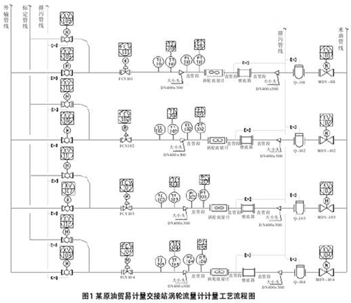 以某原油貿易計量交接站要求滿足輸量1500×104t/a為例,折算到流量為2100m3/h,若采用3用1備,單路流量至少需達到700m3/h。根據計算,選擇流量範圍為(200~2000)m3/h的DN250螺旋型柴油流量表較為合適;3用1備,每1路的流量使用在(900~1400)m3/h,每路流量在1400m3/h左右即可滿足輸量的要求。柴油流量表是一種速度式流量計,流態對其測量準確度的影響較大,應配備足夠長的直管段及整流器以保證柴油流量表進口端有良好的速度分布,以提高測量準確度等級。其工藝流程如圖1所示。