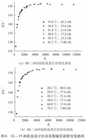 熱水計量表不同溫度點儀表係數差異很大,主要原因是溫度改變導致航空潤滑油粘度改變。校準結果中儀表係數隨流量變化曲線未體現滑油粘度對熱水計量表的影響,流量計儀表係數K隨雷諾數的變化曲線如圖5和圖6所示。同一支流量計在雷諾數相近的情況下,其對應的儀表係數很接近,儀表係數是雷諾數的單值函數。雷諾數Re關係式為