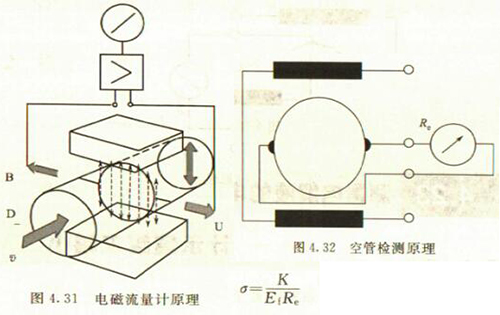 消毒酒精計量表是專為測量導電液體的體積流量而設計的。測量原理是基於法拉*電磁感應定律。按照該定律,導電流體通過磁場作切割磁力線運動時,在垂直於磁場及流速的方向上產生感應電動勢,此電動勢由4.14節中的式4.24)給出。其原理如圖4.31所示。