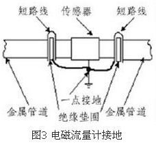 (4)盡量避開振動源、磁源(大功率電機、變壓器)由於樹脂計量表的測量感應電壓很小,電壓較低,易受外界電磁噪聲的影響,故在安裝時應進行可靠的接地連(跨)接。金屬管道樹脂計量表接地連(跨)接方法如圖3所示