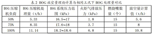 為維持 BOG 係統壓力穩定,在正常工況下通過 BOG壓縮機回收 BOG 方式進行,在檢修期間采用火炬放空方式進行。從表 2 中可以看出,在係統壓力維持一定值時,理論計算值與 BOG 壓縮機處理量基本相同,火炬氣放空量 計算方法可行。