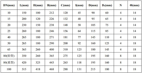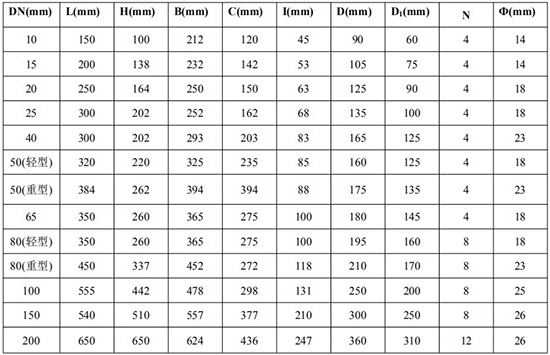 *DN10/DN50(輕型)/DN65/DN80(輕型)法蘭尺寸為 1.6MPa 標準;其餘口徑為 6.4MPa 標準;