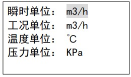 壓力單位: 壓力單位選擇。顯示單位選項可更改儀表運行時顯示的單位,進入顯示單位界麵,標況流量如果選擇為液體質量有 t/h、t/min 、kg/h 和kg/min 四個選項選擇,如果為液體體積有 m3/h、m3/min 、L/h 和 L/min 四個選項選擇;工況流量有 m3/h、m3/min 、L/h 和 L/min 四個選項選擇,選擇相應的單位,按確認鍵後,主界麵將以設置顯示單位進行數值顯示。