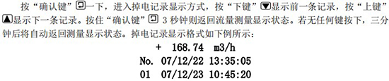 該記錄表示:*一條掉電記錄(No.1),停電時間為 07 年 12 月 22 日 13 點 35 分 05 秒,重新上電時間為 07 年 12 月 23 日 10 點 45 分 20 秒,掉電時的瞬時流量為 168.74m3/h,該次掉電時間長度為 21 小時 10 分鍾。