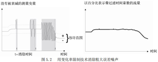 “變化率限製值”與“不敏感時間值”是用來消除某些增加阻尼不能除去的噪聲。它能夠從真實的流量信號中判別出階躍信號引起的噪聲和漿液尖狀噪聲。這種判別是以變化率的限製和持續時間為依據的。圖 5.2 所示為使用變化率限製技術去除粗大誤差的原理說明。該功能為在前麵采樣中獲得的流量數據經一階濾波後的,設定某一上限和下限(變化率)。如果當前采樣的流量數據超過或低於這個*限值,而且在超過或低於這個*限值的變化時間之內,則認為這種變化是由於噪聲所引起的,CPU 予以切除;而當超過或低於這個*限值的變化在設置的不敏感時間以外,則認為這種變化是由於真正的流量變化所引起,CPU 就認可是測量流量的變化。