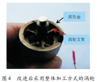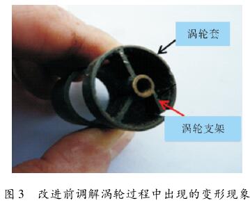 在對影響儀器流量測量的調查中發現,dn5091看片儿免费看支架不同心。dn5091看片儿免费看是阻抗找水儀流量測量的核心部件,采用的加工方式是先加工渦輪上下支架再焊接在渦輪套上,因此渦輪上下支架不容易保持同心,影響了支架上渦輪葉片轉動的靈活性,導致流量測量時啟動排量達 3 ~ 5 m 3 /d,高於技術文件上規定的 2 m 3 /d。且由於渦輪支架是焊接在渦輪套上的,在測井過程中常出現渦輪支架扭曲變形、開焊而影響測井成功率。改進前調解渦輪過程中出現的變形現象如圖 3 所示。在2015 年 182 口產出剖麵測井中,因此而未測成的井數達 26 口之多,占全年產出剖麵測井任務的 14.3% 。